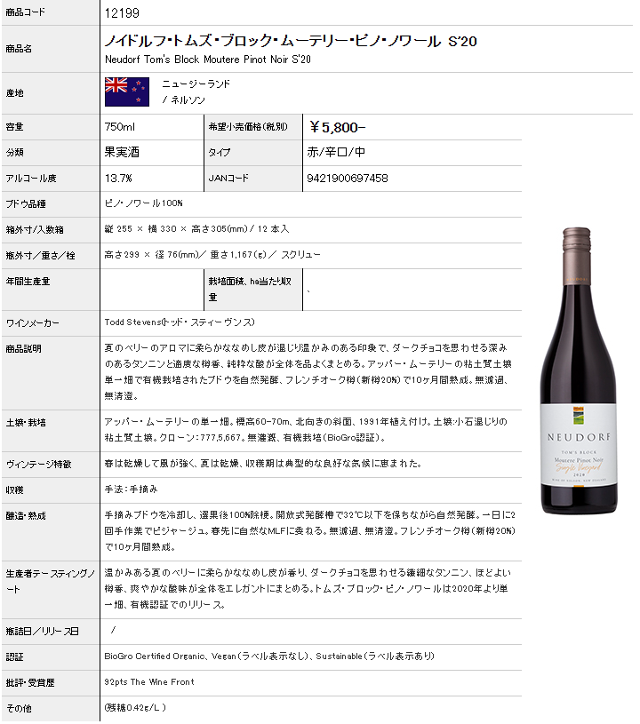 【S12199】ノイドルフ・トムズ・ブロック・ムーテリー・ピノ・ノワール S'20 | Neudorf Tom's Block Moutere Pinot Noir S'20