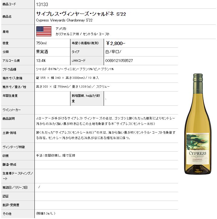 【13133】サイプレス・ヴィンヤーズ・シャルドネ S'22 | Cypress Vineyards Chardonnay S'22