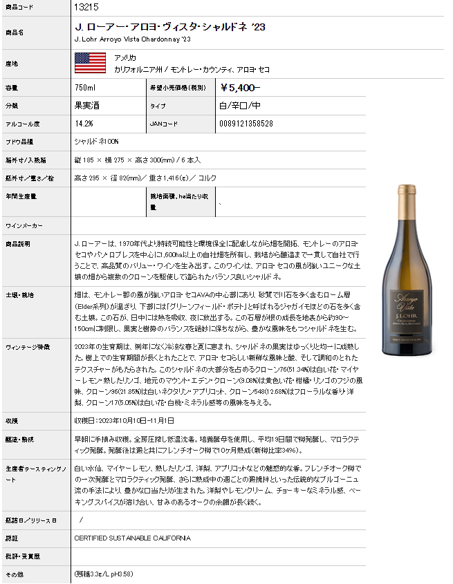【13215】J. ローアー・アロヨ・ヴィスタ・シャルドネ '23 | J. Lohr Arroyo Vista Chardonnay '23